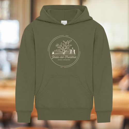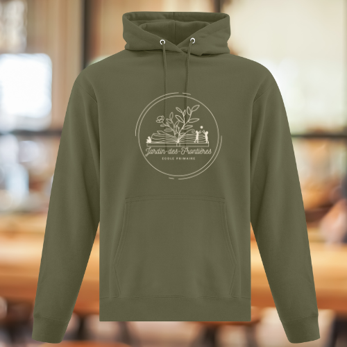 Affichez fièrement vos couleurs avec ce molleton doux à capuchon conçu spécialement pour l’école du Jardin-des-Frontières !